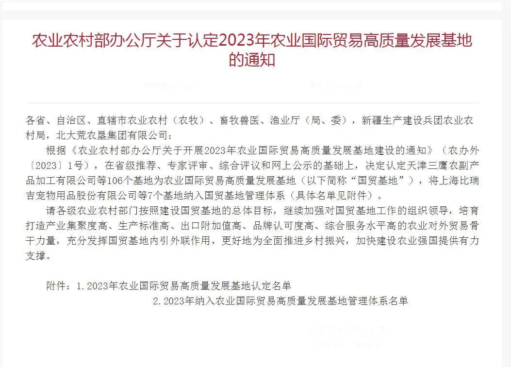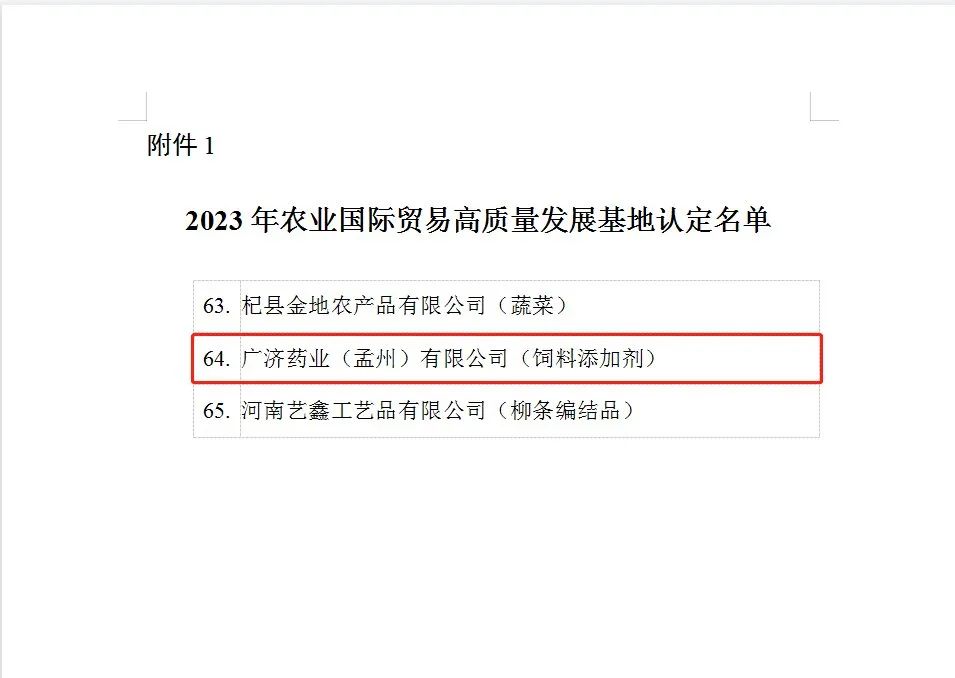 2023年7月,农业农村部公布了2023年农业国际贸易高质量发展基地认定名单,全国认定106个农业国际贸易高质量发展基地,其中河南仅3家,广济药业(孟州)有限公司榜上有名。