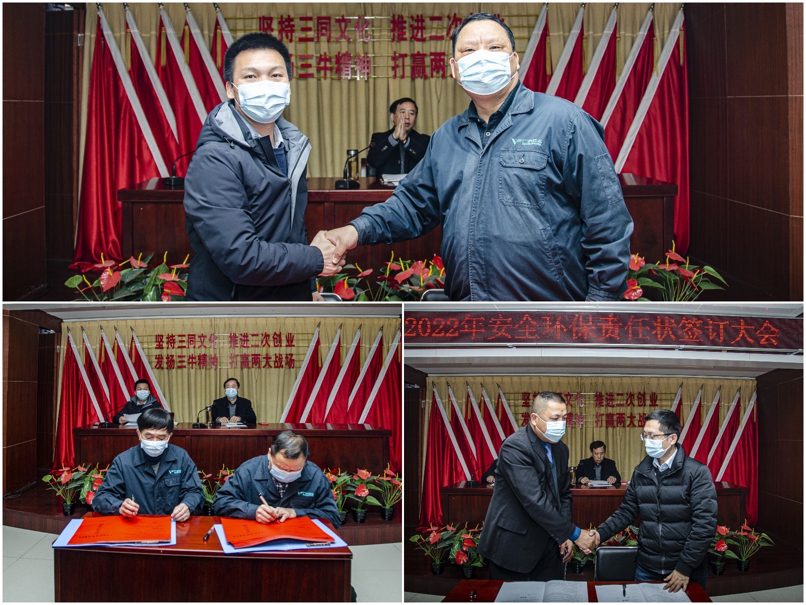 1月10日,广济药业(孟州)有限公司组织召开2022年安全、环保责任状签订大会,公司党支部书记、董事长胡勇干出席会议并讲话,支部委员、总经理黄火军主持会议。